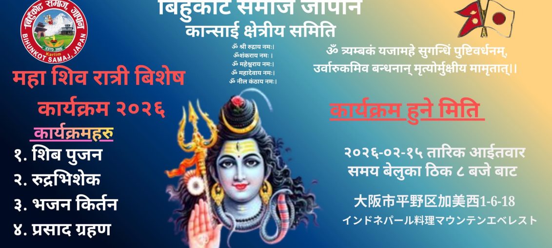 ओसाकामा महा शिवरात्रि विशेष धार्मिक कार्यक्रम आयोजना हुने प्रवास समाचार February 2, 2026February 2, 2026 ओसाका, जापान – बिहुँकोट समाज जापान, कान्साई क्षेत्रीय समितिको आयोजनामा महा शिवरात्रिको अवसरमा विशेष धार्मिक कार्यक्रम आयोजना हुने भएको छ। नेपाली समुदायलाई लक्षित गर्दै भक्ति, आध्यात्मिकता र सामाजिक एकताको सन्देश फैलाउने उद्देश्यले कार्यक्रम सञ्चालन गर्न लागिएको आयोजकले जनाएको छ। कार्यक्रम अन्तर्गत शिव पूजन, रुद्राभिषेक, भजन–किर्तन तथा प्रसाद वितरण गरिनेछ। सामूहिक रूपमा