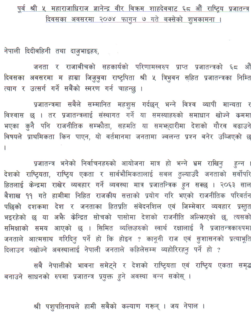 सहमति, समझदारीमा देशको गौरव बढाउने विषयले प्रथमिकता नपाएको पूर्वराजाको गुनासो समाचार February 19, 2018 काठमाडौं । पूर्वराजा ज्ञानेन्द्र शाहले वर्तमान राजनीतिक व्यवस्थामाथि नै प्रश्न उठाएका छन् । निर्वाचन गर्नु मात्र प्रजातन्त्र नभएको भन्दै उनले २०६३ बैशाख ११ पछि भएको राजनीतिक परिवर्तनको समीक्षा गर्ने बेला आएको बताएका छन् । प्रजातन्त्र दिवसको अवसर शुभकामना सन्देश दिँदै पूर्वराजा ज्ञानेन्द्र शाहले प्रजातन्त्रलाई संस्थागत गर्ने वा समस्या समाधान खोज्ने क्रममा भएका सहमति, समझदारीमा देशको गौरव बढाउने विषयले प्रथमिकता नपाएको गुनासो गरेका छन् । उनले भनेका छन्, प्रजातन्त्र भनेको निर्वाचनहरुको आयोजना मात्र होभन्ने भ्रम राखिनु हुँदैन । देशको राष्ट्रियता, राष्ट्रिय एकता र सार्वभौमिकतालाई सबल तुल्याउँदै जाताको सर्वोपरी हितलाई केन्द्रमा राखेर व्यवहार गर्ने व्यवस्था मात्र प्रजातान्त्रिक हुनसक्छ ।’ ११ वैशाख २०६३ मा भएको राजनीतिक परिर्वतन पछिको दशकमा देश र जनताको हितप्रति संवेदशीलता एवं जिम्मेवार व्यवहार प्रस्तुत भइरहेको छ या अझै केन्दि्रत सोचको पासमा देशको राजनीति अल्भिएको छ ? समीक्षा गर्नुपर्ने उनले बताएका छन् । पूर्वराजा ज्ञानेन्द्रले भनेका छन्, ‘सीमित व्यक्तिहरुको स्वार्थ रक्षालाई नै प्रजातन्त्रको रुपमा जनताले आत्मसाथ गरिदिनुपर्ने हो कि होइन ? कानुनी राज एवं सुशासनको प्रत्याभूति दिलाउन नखोज्ने अवस्थालाई नेपाली जनताले कहिलेसम्म व्यहोर्नुपर्ने हो ?’ उनले सबै नेपालीको भावना समेट्ने र देशको राष्ट्रियता एवं राष्ट्रिय एकता समृद्ध बनाउने साधनको रुपमा प्रजातन्त्र प्रयुक्त हुने अवस्था बन्न सकोस् भनेका छन् ।हेर्नुस् पूर्वराजाको शुभकामना सन्देश